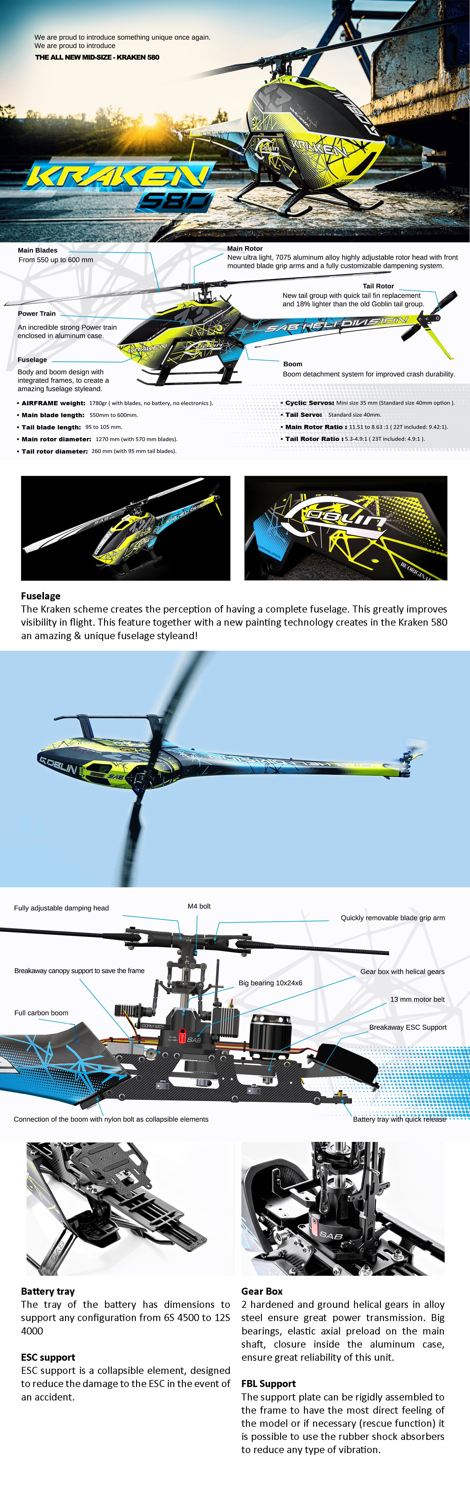 Introducing the all new Kraken 580... an incredible machine with super strong drive train enclose in an aluminum case. Its innovative body and boom design creates an amazing fuselage styling.. An unique machine once again!